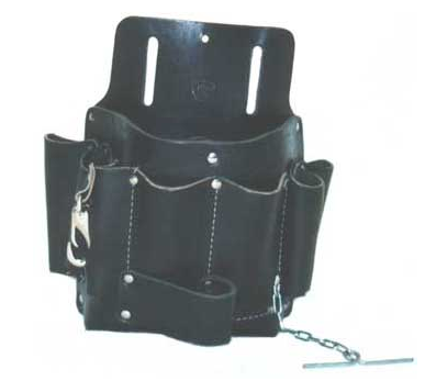 Master electricians pouch. Top grain leather, tape sling, quick release snap, inside corrugated leather strip for screwdrivers and small wrenches. Leather hammer holder and 7 outside pockets. 2 1/2″ belt slots. Rivet reinforced to give greater strength and rigidity.