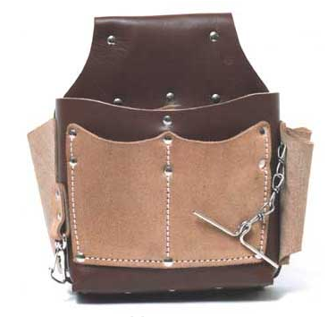 Large heavy duty tool pouch, split leather, large main pocket containing 4 back wall tool slots and 1 flared double pocket, full grain pocket, 3 tapered screwdriver holders, nickel tool snap, tape holder 2.5″ wide tunnel belt loop, plastic backing and rivet reinforced to give greater strength and rigidity.