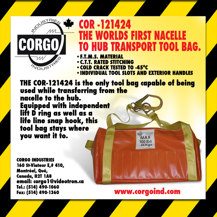THE COR-121424 is the only tool bag capable of being used while transferring from the nacelle to the hub. Equipped with independent lift Dee rind as well as a life line snap hook, this tool bag stays where you want it to.