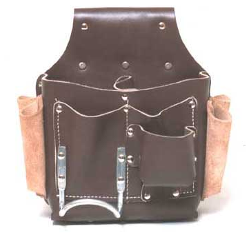 Large heavy duty tool pouch, top split leather, large main pocket containing 4 back wall tool slots and 1 flared double pocket, outside pocket, 4 tapered screwdriver holders top grain, nickel tool snap hammer holder, tape holder, 2.5″ wide tunnel belt loop, plastic backing and rivet reinforced to give greater strength and rigidity.