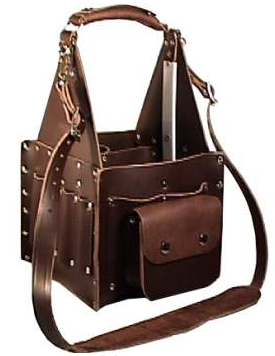 Square tool pouch. The biggest there is. Carrying handle reinforced with plastic to avoid collapses.Complete with shoulder strap and accessory pouch. Numerous pockets and compartments. Sewn and riveted to give greater strength and rigidity. 7-8 oz Leather.